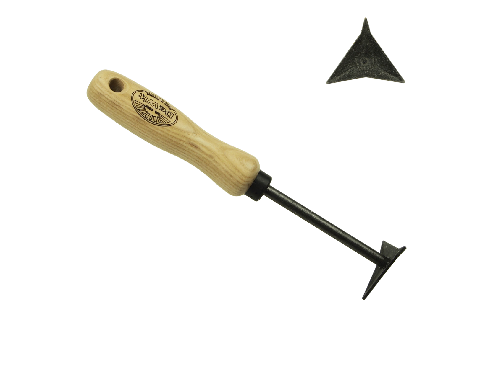 Denne fugerenser er fremstillet af hærdet borstål og udstyret med et solidt greb i asketræ. Den er designet til effektiv og skånsom rensning af fuger mellem fliser.